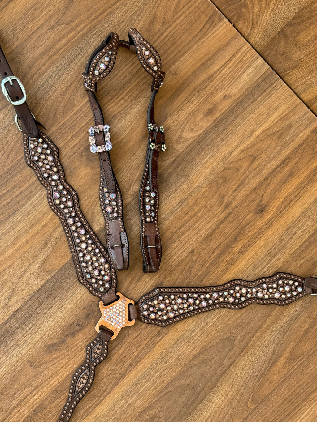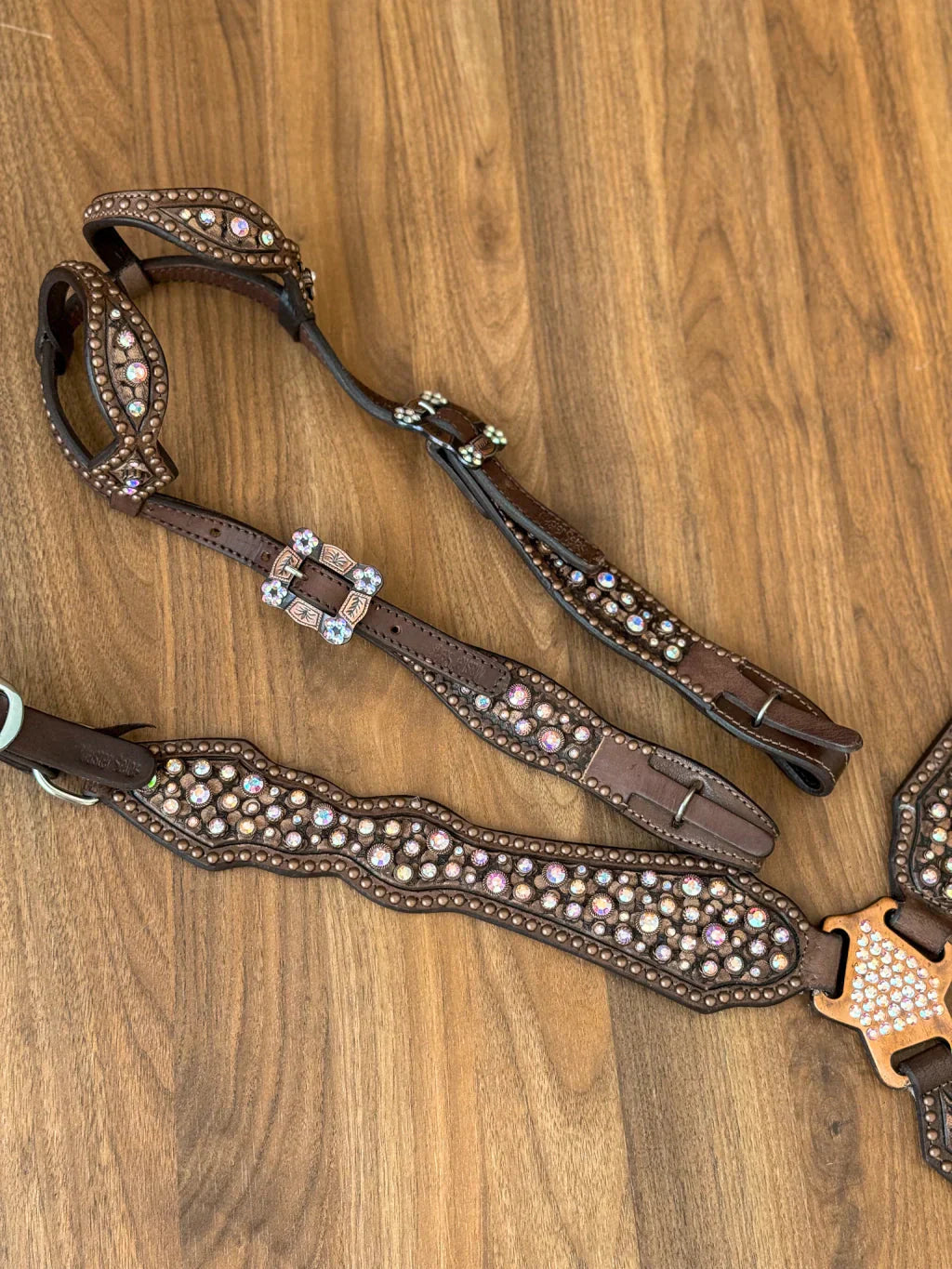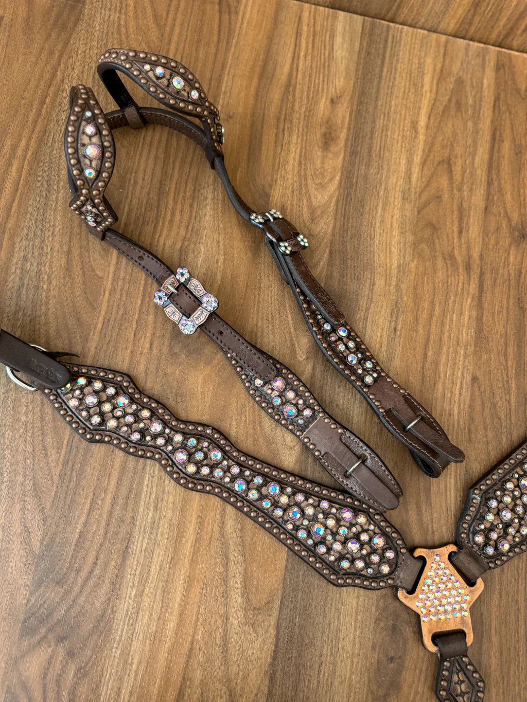 Fabricado em couro legítimo com aplicação em strass original.